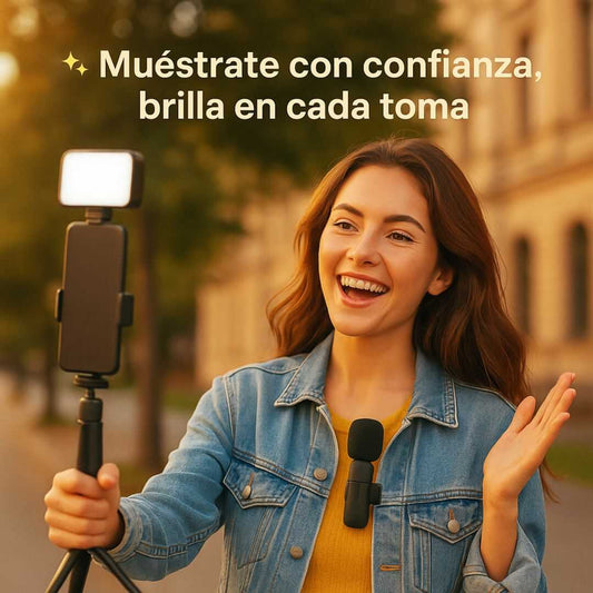 ✨ Tu Estudio Portátil: Trípode 360° + Micrófono Solapero