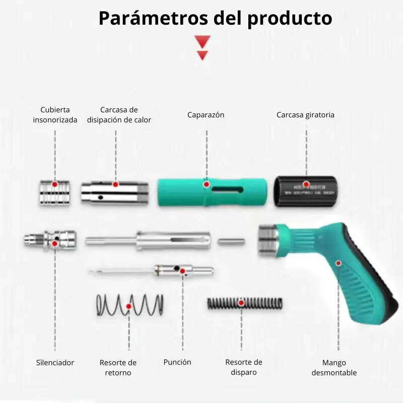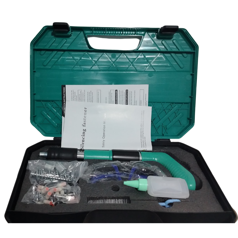 Pistola de remaches y clavos, es una herramienta de alto rendimiento. El silenciador de acero más grueso reduce el ruido y es más seguro.
