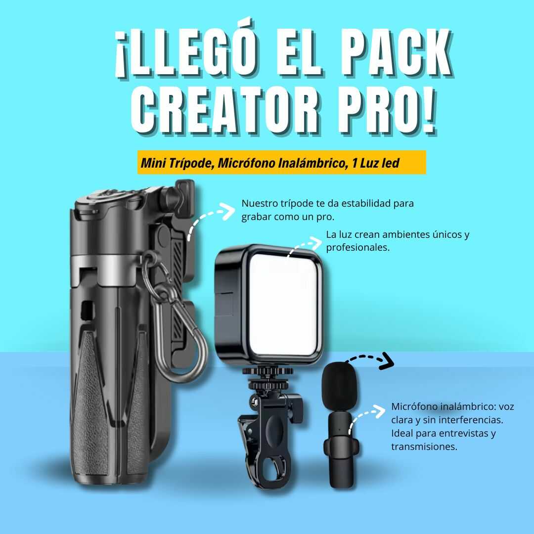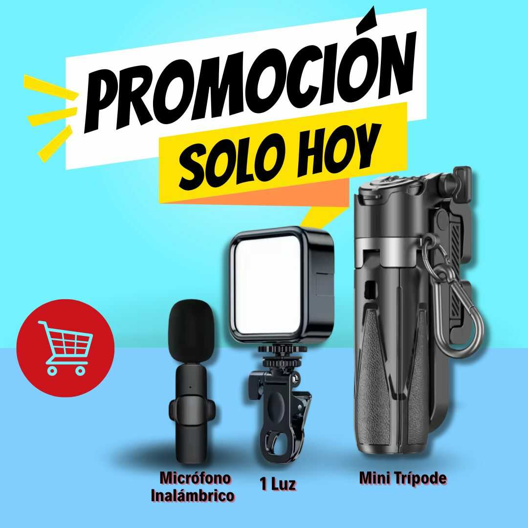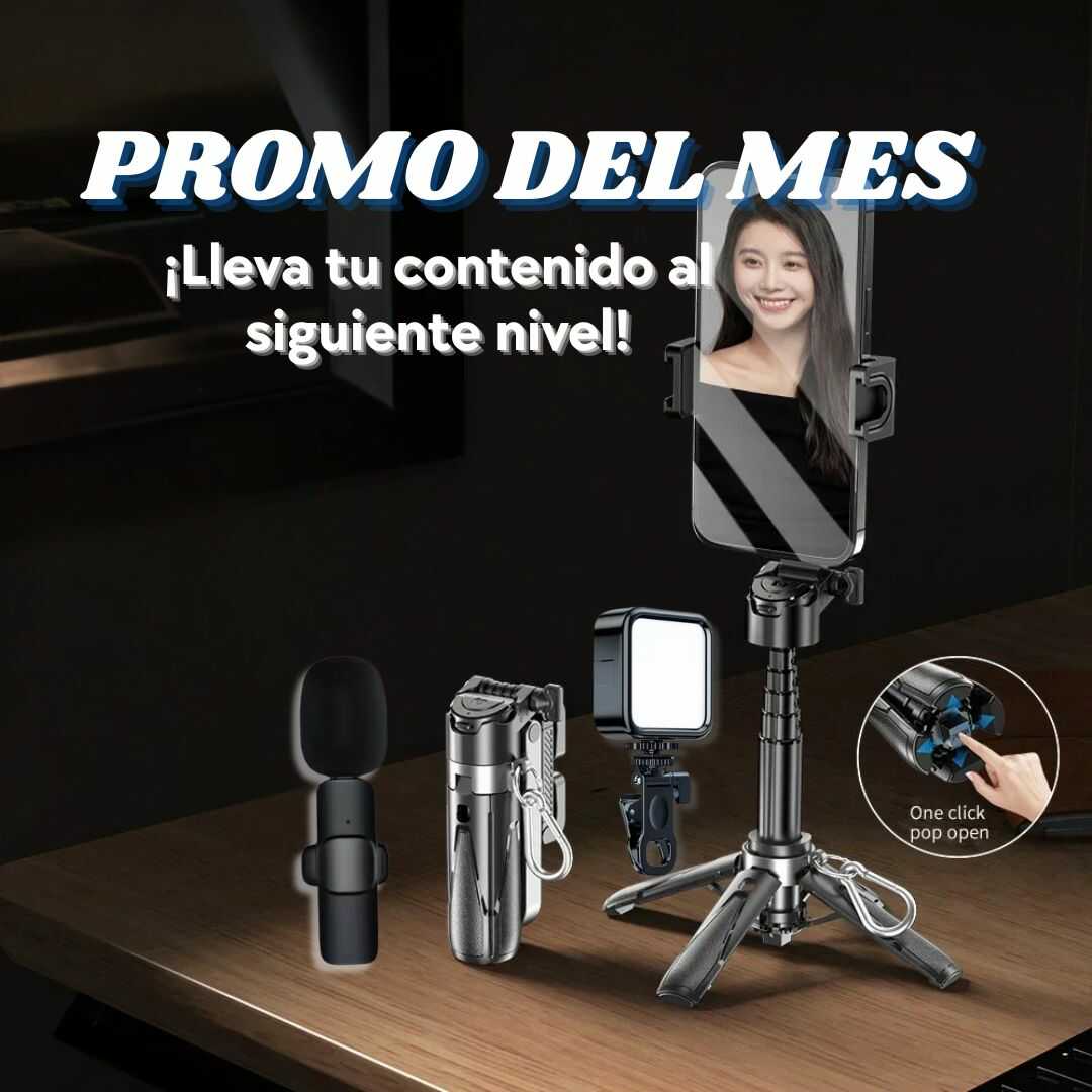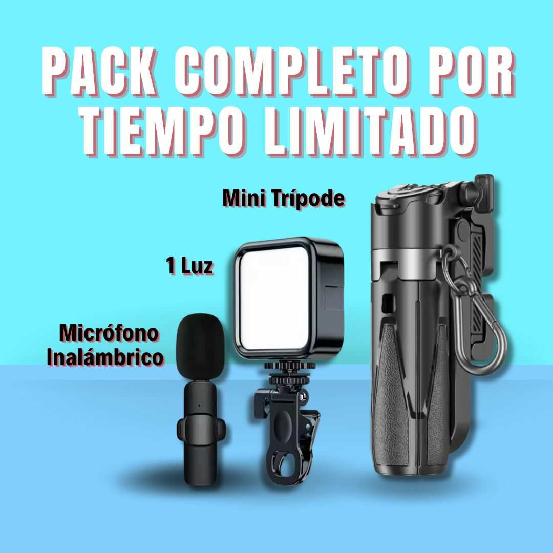 Este pack es tu llave para mostrar talento al mundo: graba con estabilidad gracias al mini trípode, haz que tu voz suene clara con el micrófono inalámbrico y dale luz a tu creatividad con la luz LED.