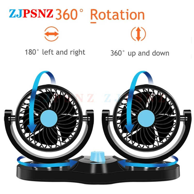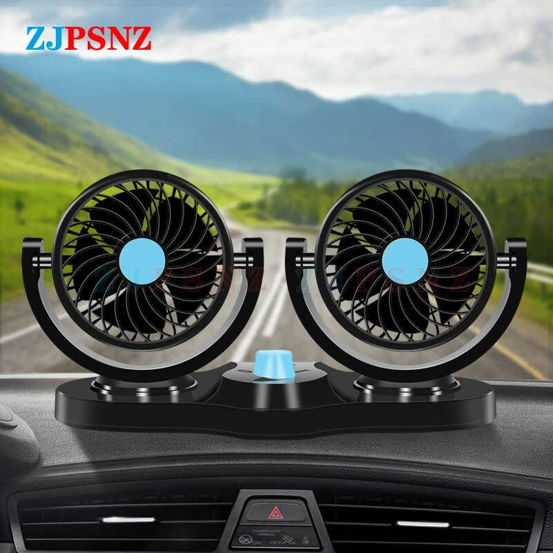 Ventilador portátil de 12 V para auto con velocidad ajustable, fuerte y débil, diseño de cabezal doble para satisfacer las necesidades de diferentes personas.
